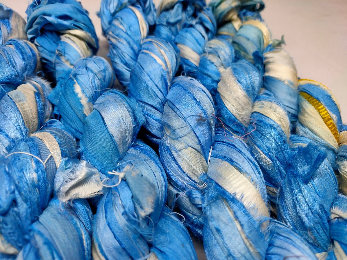 Recycled Sari silk Ribbon is the by-product of colorful saris that women wear in India. It is the loose ends of saris collected from industrial mills in India that is torn in stripes and sewn end to end to make beautiful and colorful ribbons. The vibrant colors and unique texture of these silk fabric, the sari silk ribbons are inspirational to designers, knitters, and artisans. The popularity of recycled silk ribbon has extended beyond India and has created an empowering cottage industry primarily benefiting women.