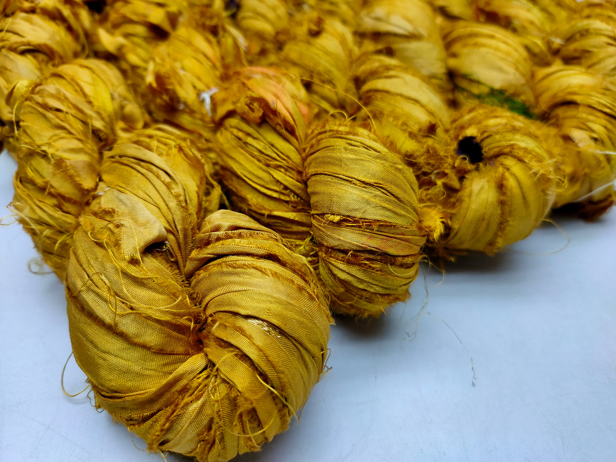 Recycled Sari silk Ribbon is the by-product of colorful saris that women wear in India. It is the loose ends of saris collected from industrial mills in India that is torn in stripes and sewn end to end to make beautiful and colorful ribbons. The vibrant colors and unique texture of these silk fabric, the sari silk ribbons are inspirational to designers, knitters, and artisans. The popularity of recycled silk ribbon has extended beyond India and has created an empowering cottage industry primarily benefiting women.