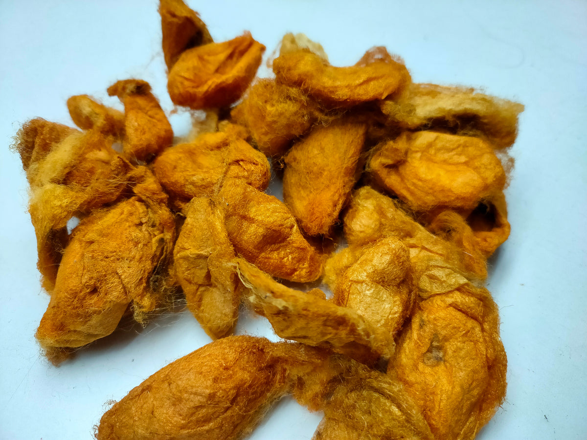 Eri silk comes from the caterpillar of Samia cynthia ricini, found in northeast India. The name "eri" is derived from the Assamese word "era", which means "castor", as the silkworm feeds on castor plants. One of the common names, the "Ailanthus silk moth", refers to the host plant. Eri silk is also known as endi or errandi in India. The woolly white silk is often referred to as the fabric of peace when it is processed without killing the silkworm. This process results in a silk called Ahimsa silk. Moths leave the cocoon and then the cocoons are harvested to be spun. The eri silkworm is the only completely domesticated silkworm other than Bombyx mori.